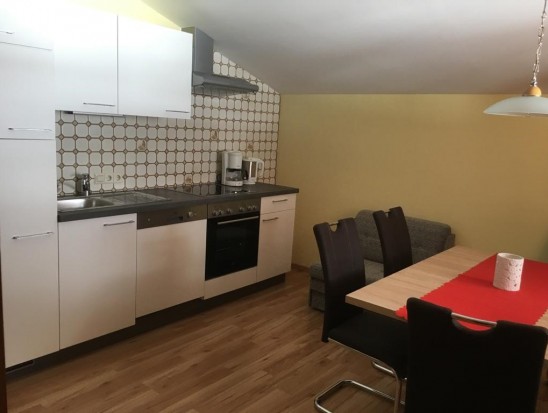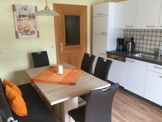 - Geräumige Wohnküche inkl. E-Herd, Backrohr, Kühlschrank mit Gefrierfach, Filter-Kaffeemaschine und Wasserkocher, Essecke mit Flat-TV und SAT