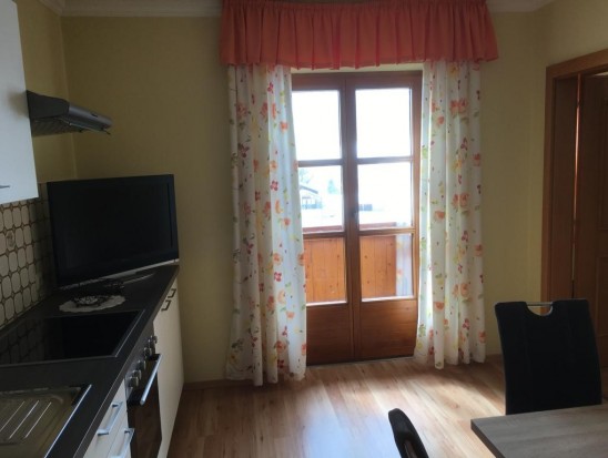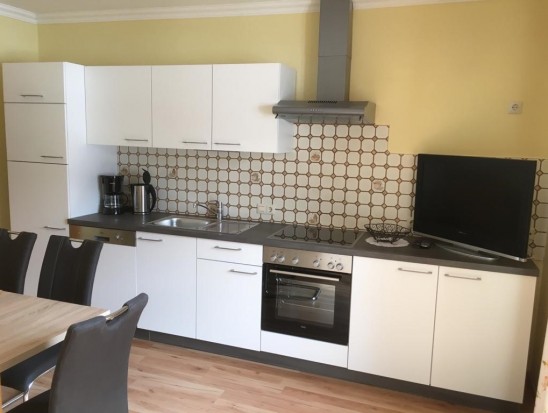 - Geräumige Wohnküche inkl. E-Herd, Backrohr, Kühlschrank mit Gefrierfach, Filter-Kaffeemaschine, Wasserkocher und Geschirrspüler, Essecke, Flat-TV mit SAT und Balkon