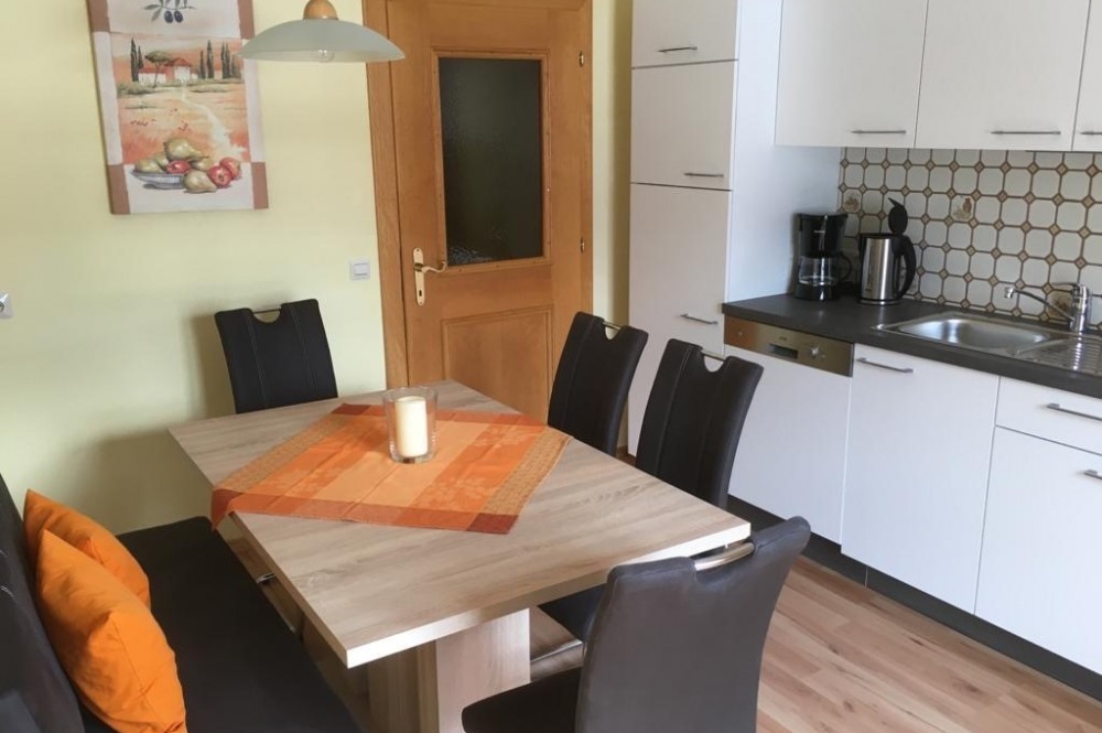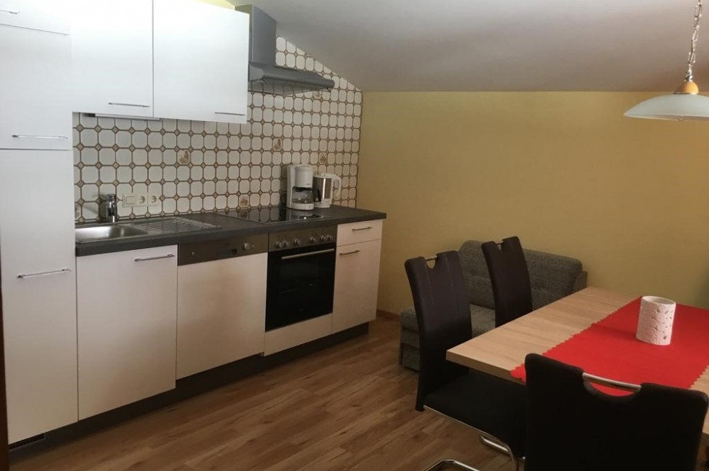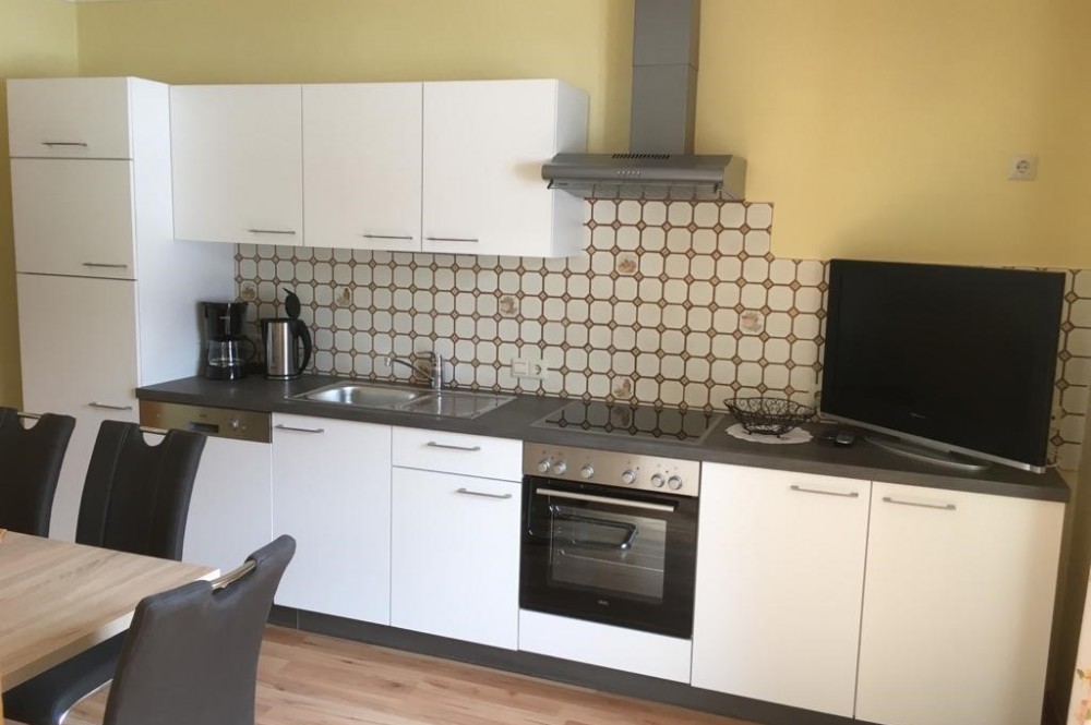 - Geräumige Wohnküche inkl. E-Herd, Backrohr, Kühlschrank mit Gefrierfach, Filter-Kaffeemaschine und Wasserkocher, Essecke mit Flat-TV und SAT